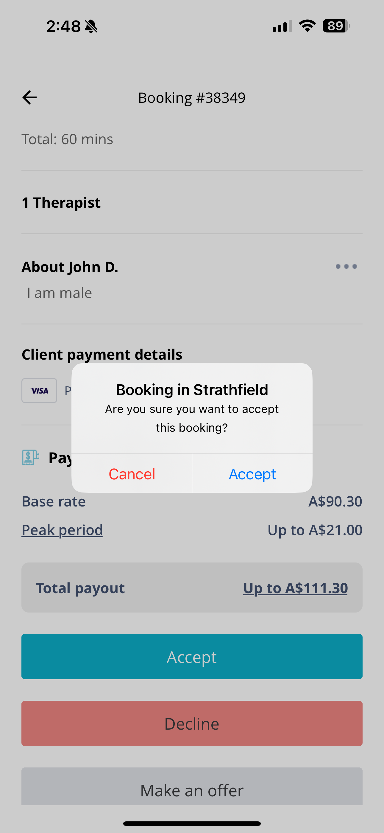 - If you accept the booking at 6:00 PM then the payout is calculated as $111.30 with the Peak period fee of $21 as the peak period starts at 6:00 PM.